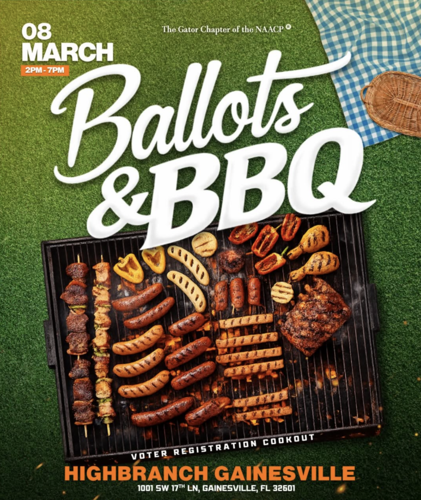 The Gator Chapter of the NAACP presents Ballots & BBQ a voter registration cookout 🗳️